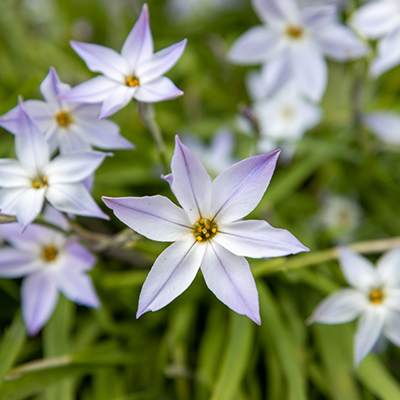 A particularly novel and attractive use of bulbs is to plant 2 to 4 dozen Spring Starflowers (Ipheion uniflorum) in your lawn. Scatter them widely. Punch a hole about 2-1/2 inches deep and drop the bulb in. The flowers will bloom in the lawn during spring and the foliage blends with grass leaves during the rest of the year.