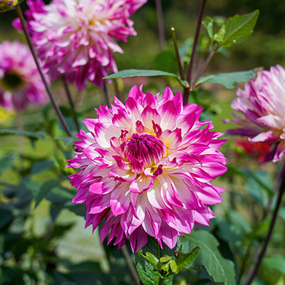 DAHLIAS DO NOT PRODUCE ONE KIND OF FLOWER. There are twelve different flower forms with blooms ranging from ten inches in diameter on the decorative (dinner plate) type down to the one inch pompons. The pompons may be only one foot tall while the dinner plate forms are up to six or seven feet tall. All are hybrids of two or three plants brought up from Mexico and South America in the 1800s. And, all are deer and rodent resistant.