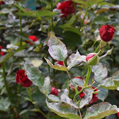 Powdery mildew is the most common fungus disease of roses. It appears as a white to gray powder coating upper, leaf surfaces. In severe cases it will also be found on lower leaf surfaces and coating emerging flower buds. Initially, it can be rubbed off between the thumb and fore finger but soon reappears. It can be prevented if Safer® Garden Fungicide or a mixture of Monterey Liqui-Cop® (one tablespoon per gallon of water) and Master Nursery® Year Round Spray Oil (four tablespoons per gallon of water) is sprayed and covers the plant to dripping before the plant shows symptoms of the disease. Copper sprays with less than 25% Copper are of little value. A mixture of Monterey Liqui-Cop® at one tablespoon per gallon, plus Master Nursery® Year Round Spray Oil at five tablespoons per gallon H20 and Bonide® Fung-onil ™ (Chlorothalonil) are used as preventives and eradicants. The spread of powdery mildew will be reduced when the plants receive an overhead water spray. The water washes off the spores from the mildew and when spores land in water, they die. Irrigate in mid-morning so plants dry rapidly and reduce the likelihood of other fungus infections such as black spot or rust.