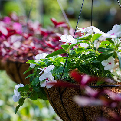 If you are preparing your own hanging basket, use a high-quality potting soil such as Master Nursery® Gardener’s Gold™; plan on using a basket ten or more inches in diameter. When the basket features a single variety of plant such as: Fuchsia, Rose, Abutilon, Bougainvillea, Lantana, Jasmine, Chrysanthemum or Cyclamen, position only one plant in the center. A plant from a four inch container will soon fill the basket. A one-gallon plant requires a 16 inch basket.
