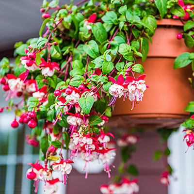 At the beginning of the second growing season, the plant should be pruned and repotted. This is necessary for plants such as Fuchsias, Geraniums, Roses, Begonias, etc. When repotting a plant, knock it out of the container after trimming the top back to the edge of the pot. Then, trim one or two inches off the root ball all the way around and off the bottom. Return the plant to its container and refill with Master Nursery® Gardener’s Gold™ Potting Soil and water thoroughly. Fertilize and irrigate the baskets as described above. Fuchsias should be sprayed with GardenTech Sevin® at this time and then monthly to prevent infection by Fuchsia mites.