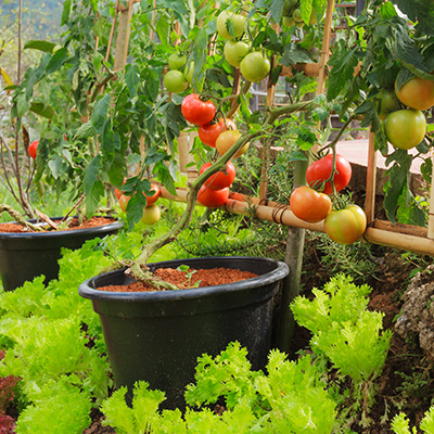 An example of a planting in a 15 gallon container would be: an Early Girl Tomato in the center surrounded by a five foot tomato cage and half a dozen Bibb Lettuce plants along the rim of the container. Another 15 gallon container could contain one Ambassador Zucchini or 8 Bush String Beans which are allowed to drape over the sides.